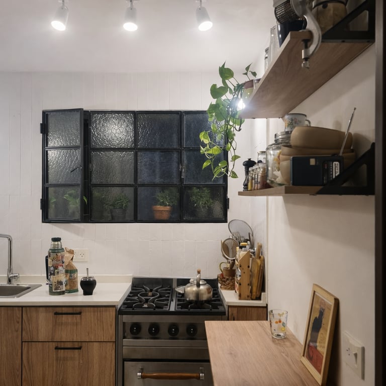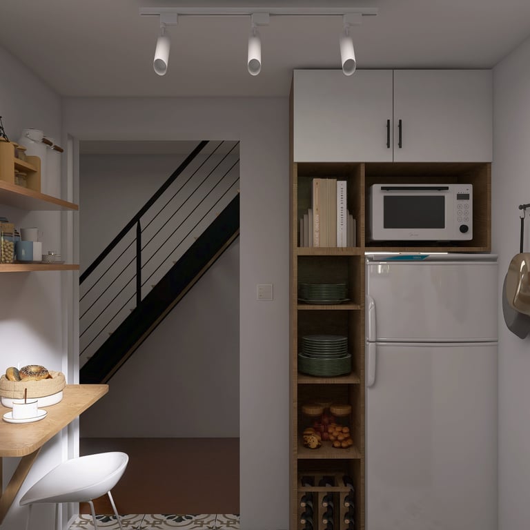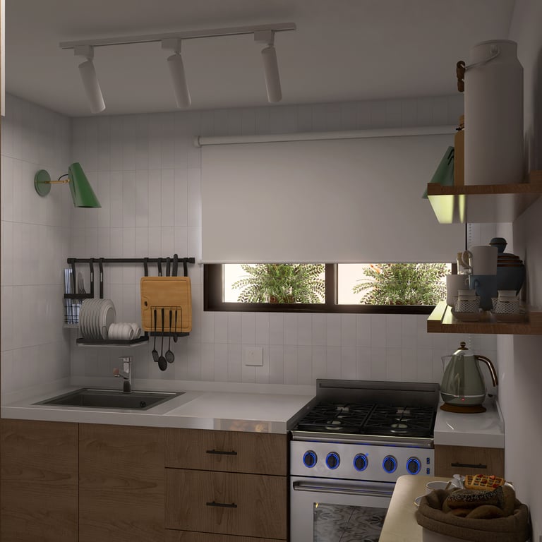 Diseño de cocina moderna y funcional en un espacio reducido. Se optimizó el guardado, se mejoró la circulación y se renovaron instalaciones visibles de gas y agua. La paleta de colores aportó calidez y equilibrio al ambiente.