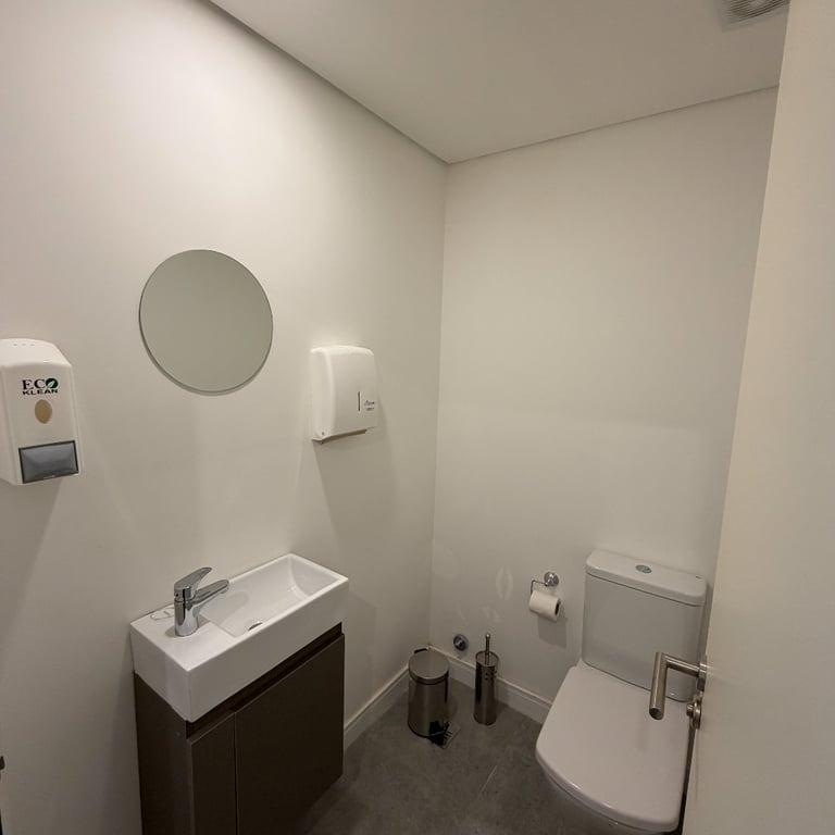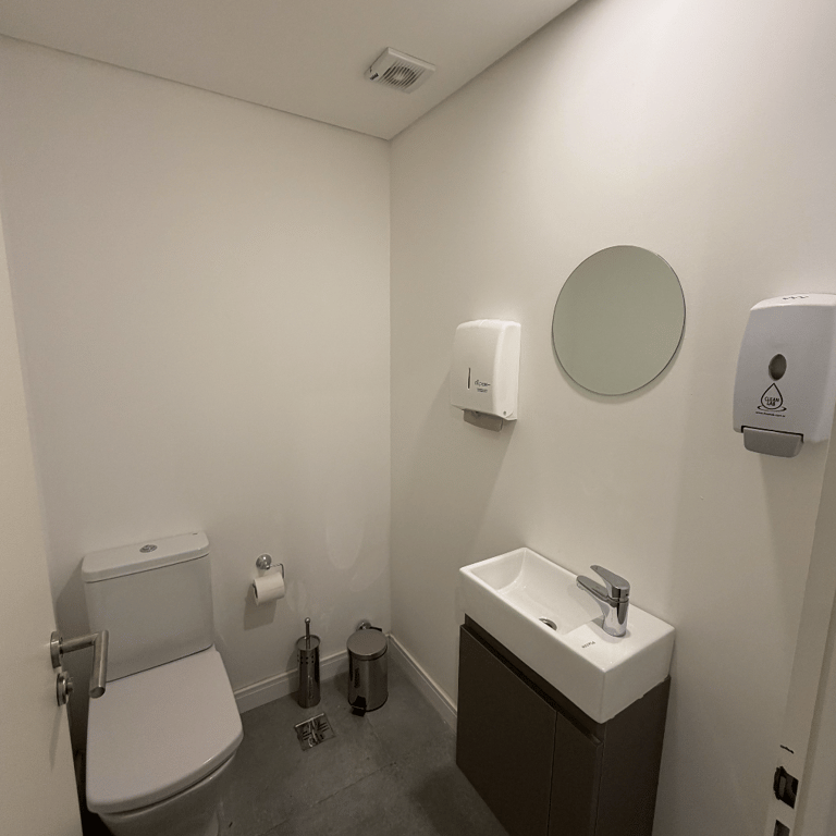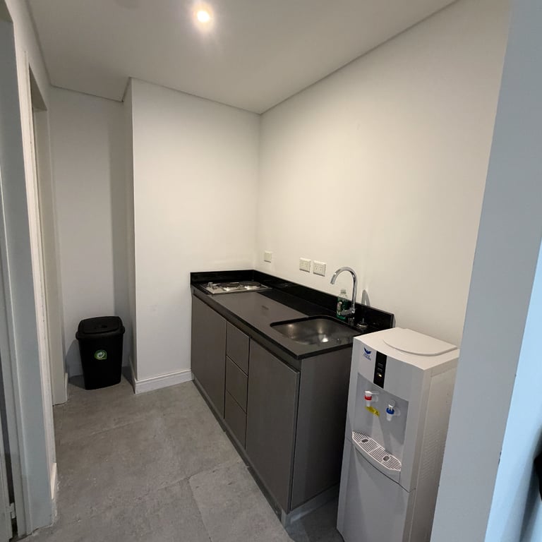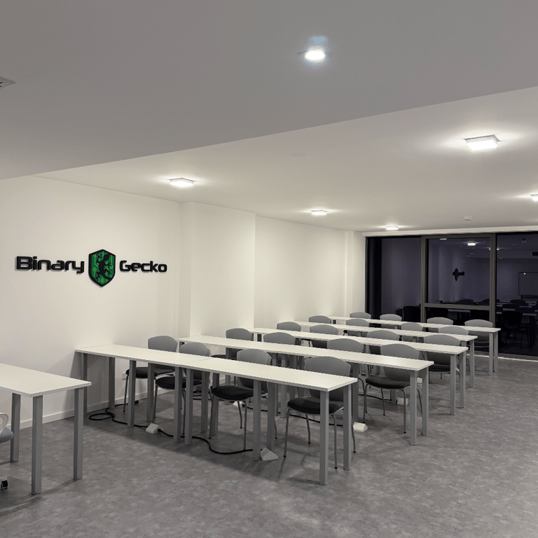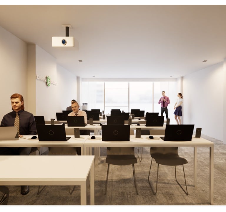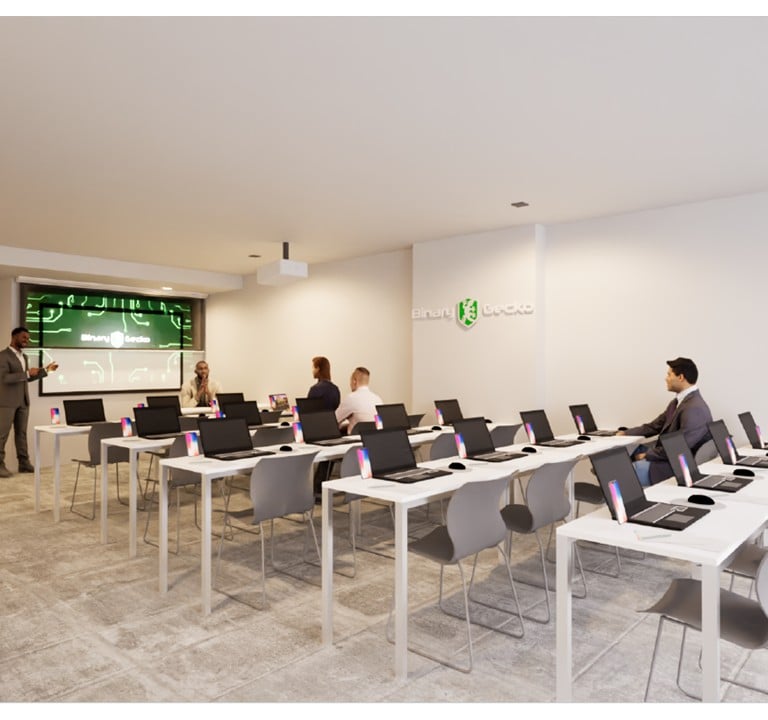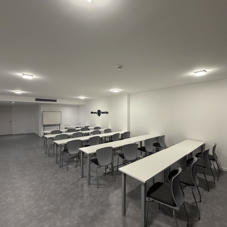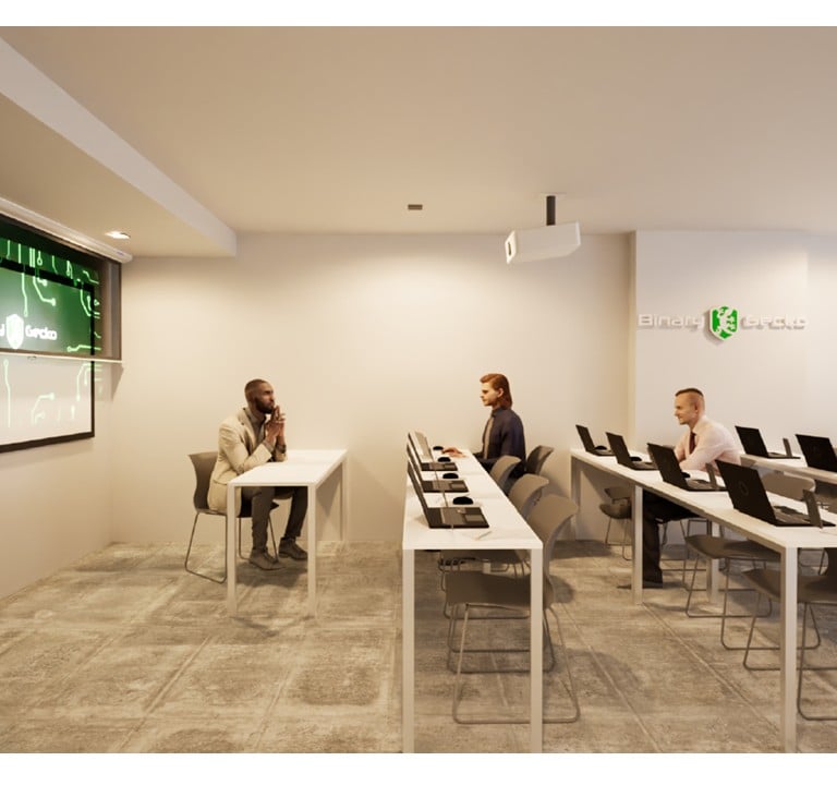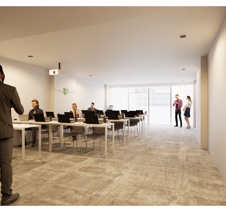 Acondicionamiento de un espacio de 75 m² para academia de capacitación en seguridad informática. Diseño con paleta neutra, iluminación eficiente, piso apto para alto tránsito y aplicación de identidad visual de la empresa en accesos y sala principal.