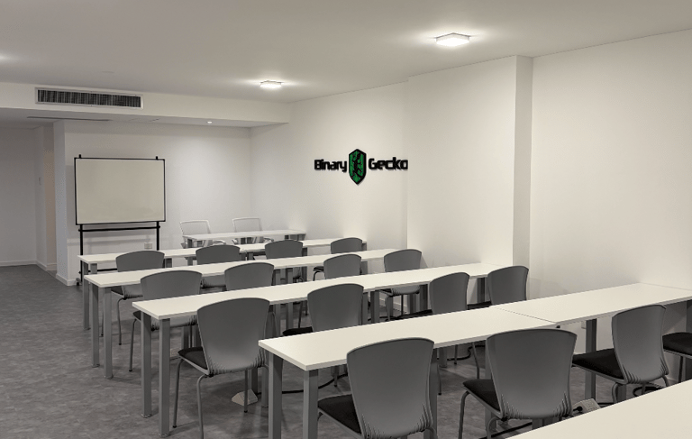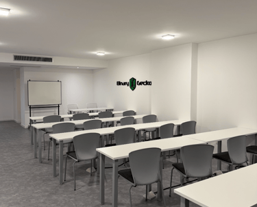 Acondicionamiento de un espacio de 75 m² para academia de capacitación en seguridad informática. Diseño con paleta neutra, iluminación eficiente, piso apto para alto tránsito y aplicación de identidad visual de la empresa en accesos y sala principal.