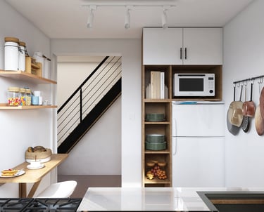 Diseño de cocina moderna y funcional en un espacio reducido. Se optimizó el guardado, se mejoró la circulación y se renovaron instalaciones visibles de gas y agua. La paleta de colores aportó calidez y equilibrio al ambiente.